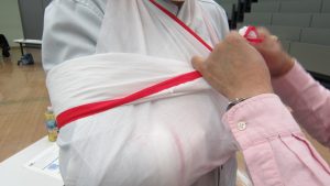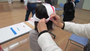 参加者の皆様には、三角巾の使用方法や搬送法等の実技を学んでいただきました。 特に三角巾を使用した処置では、止血の方法や骨折した際の固定の方法などについて指導員の説明を受けた後、実技に励んでおりました。 参加者からは「何度も繰り返すことが大切」「会社の担架練習時に活用する」といった声がありました。