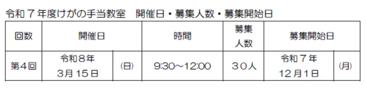 次回は令和8年3月15日(日)千葉市消防局(セーフティーちば)【中央区長洲1-2-1】で開催します。 開催時間 9時30分から12時00分まで 定 員 30名 教材費 990円(訓練用三角巾2枚) 先着順で受付しておりますので、お早めにお申し込みください。 詳しくはこちらよりご確認ください。
