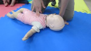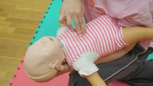 それぞれの会場で小さいお子さんをお持ちのお父さんやお母さんに参加いただき、赤ちゃんに対する心肺蘇生法とAEDの取扱い要領、窒息の処置について実技を交えながら学んでいただきました。